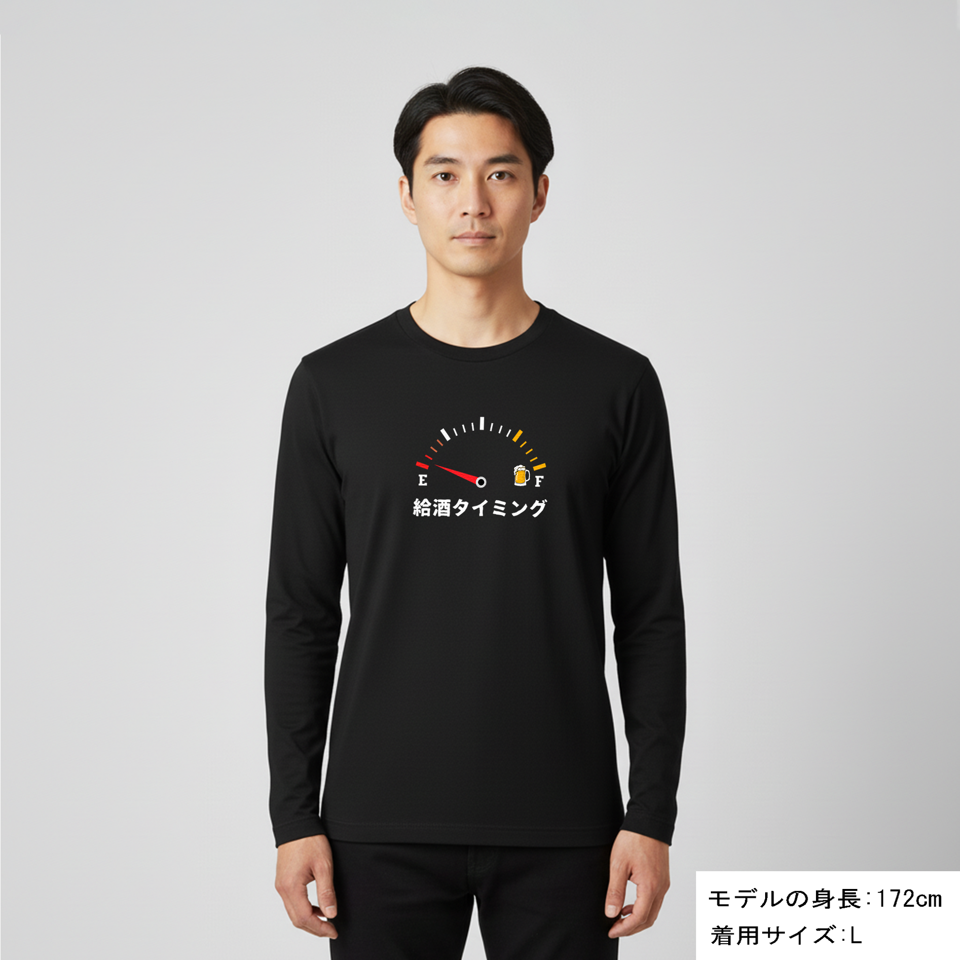 「給酒タイミング1」誕生日プレゼントにも最適!居酒屋・飲み会で話題の面白長袖tシャツ|日本酒・ビール・焼酎・ウイスキー好きにおすすめ