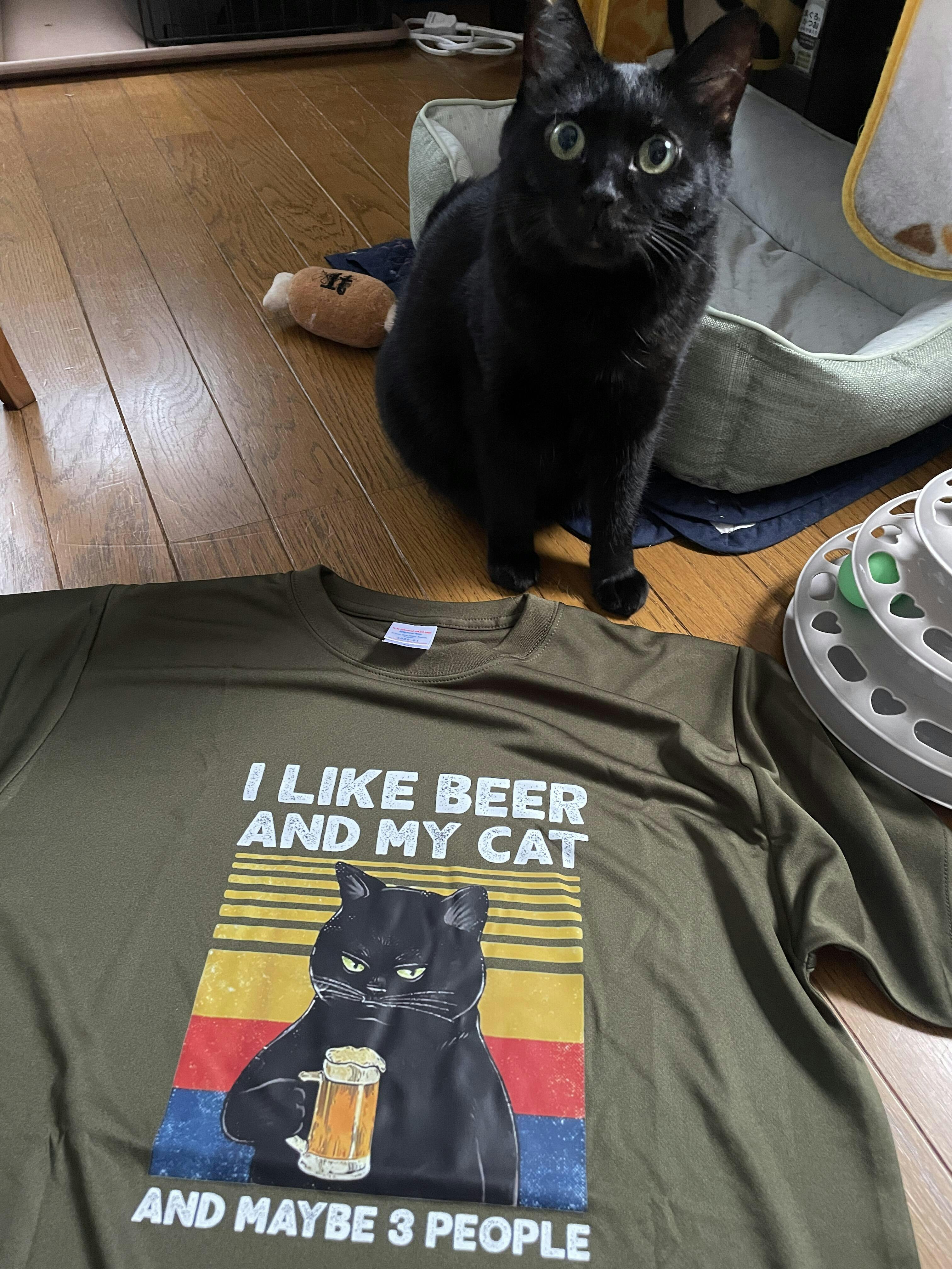 ビール好きで黒猫の飼い主にピッタリのTシャツです。アルバイト先でも可愛いと好評でした。どうしてもオリーブ色が欲しかったので、ドライシルキータッチにしましたが、綿でこの色があれば尚良かったです!